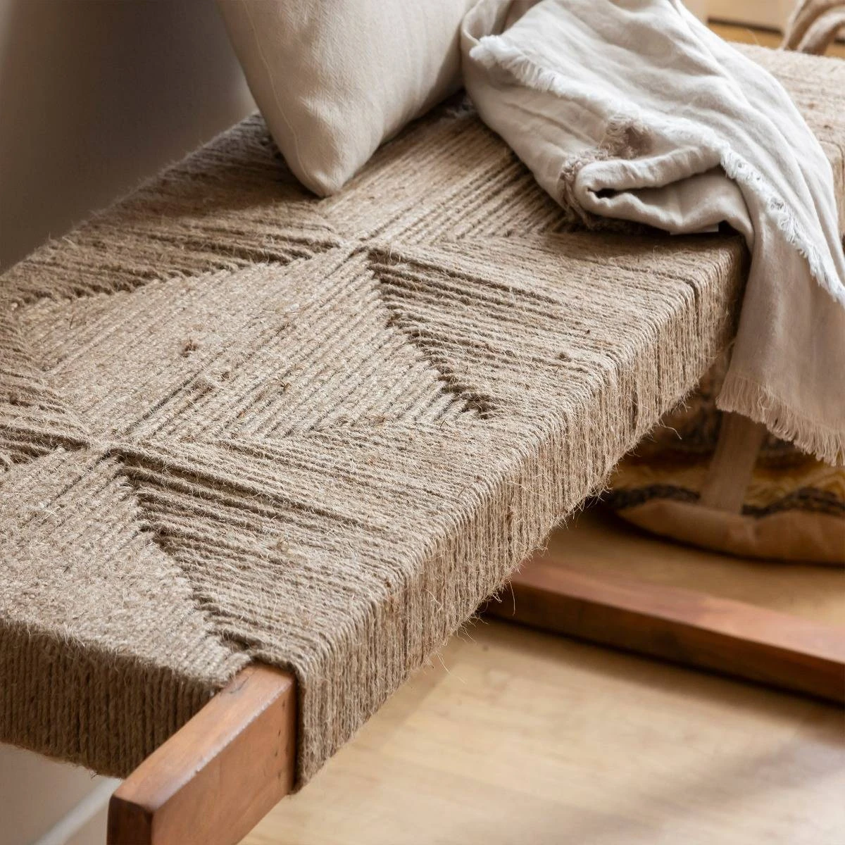 Côté conception, on est sur une structure design et une assise tisée. Le cordage beige s’allie magnifiquement bien aux nuances foncées du bois d’acacia. On est au max de la tendance bohème.