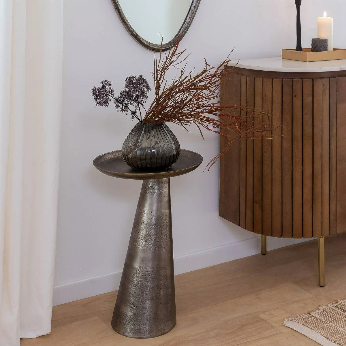 Voici le bout de canapé Marco, un magnifique bout de canapé de couleur bronze, parfait pour apporter une touche d’élégance vintage à votre salon. Ce meuble de classe est fabriqué en aluminium et offre un pied original en forme de cône qui a été conçu pour aider la pièce à se démarquer parmi les autres meubles. Le bout de canapé Marco en aluminium mesure 56 cm de haut et 39 cm de large, ce qui lui permet de s’adapter parfaitement à n’importe quel espace tout en étant suffisamment grand pour faire une déclaration.