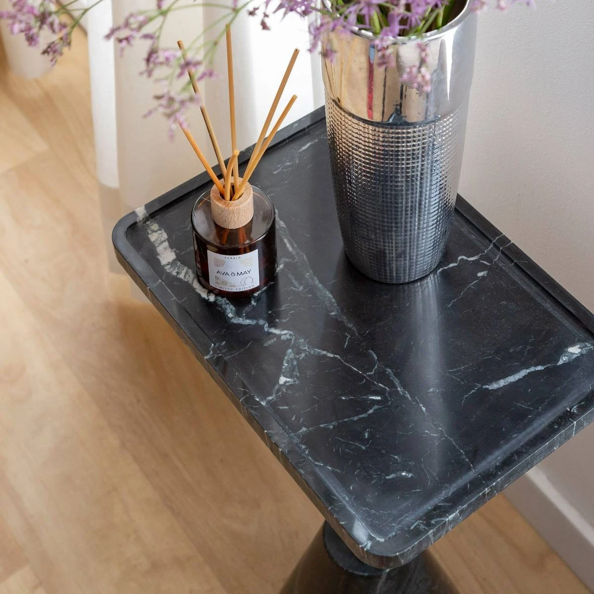 Fabriqué en marbre noir, le dessus et le pied présentent un beau marbre tourbillonnant avec des veines noires et blanches et une structure en métal noir épuré qui ajoute une touche de modernité. Ce meuble a été conçu dans le style contemporain de la collection Maxime. Il allie donc une sophistication classique à des finitions modernes pour une allure tout à fait séduisante. Il mesure 51 cm de haut et 35 cm de large, ce qui est parfait pour les petits coins ou pour un emplacement stratégique dans un plan d’étage ouvert.