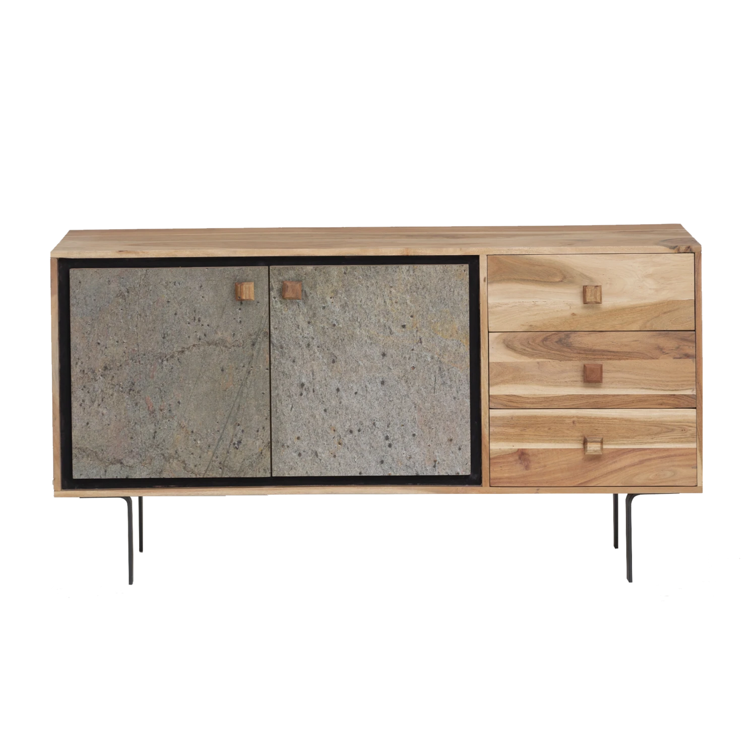 Ce buffet bois massif deviendra sans aucun doute la pièce maitresse de votre salle à manger. On aime particulièrement le mélange entre le bois et la pierre, cette association très originale marque les esprits. Les portes en pierre confèrent un charme incontestable et un cachet intemporel. Conçu à partir de matériaux de qualité, il vous accompagnera durant les grandes étapes de votre vie et se transmettra de générations en générations
