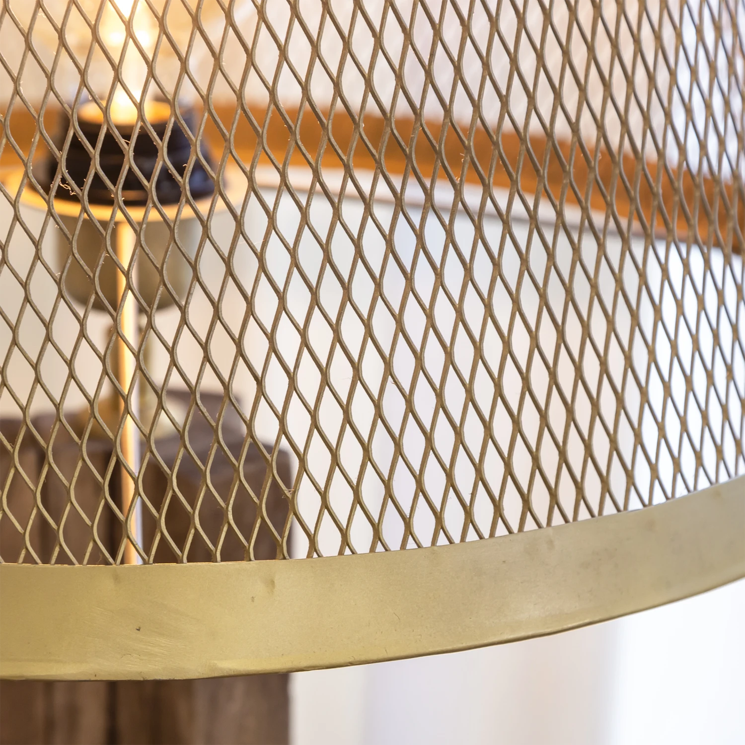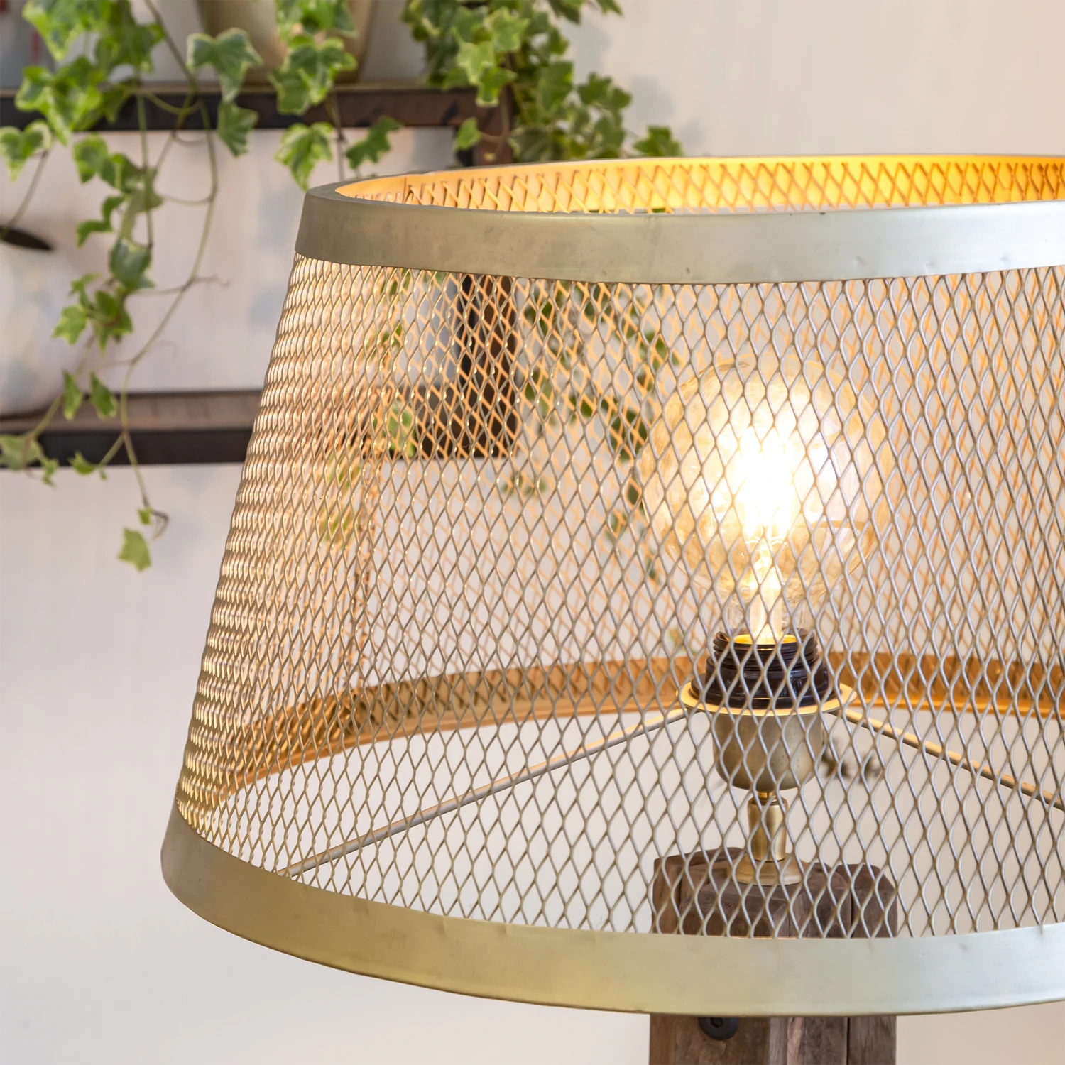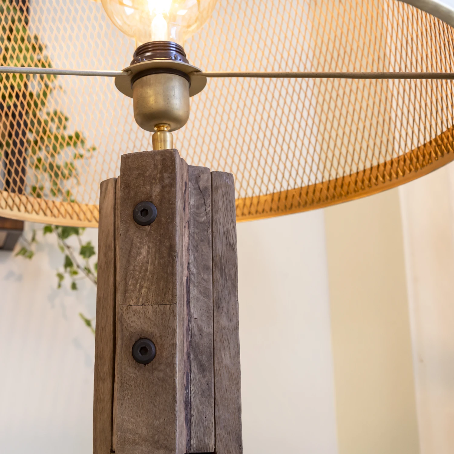 On retrouve un piétement trépied en bois de manguier pour la robustesse et pour la durabilité. On retrouve un abat-jour en métal doré qui est ajouré pour l’effet lumière tamisée.