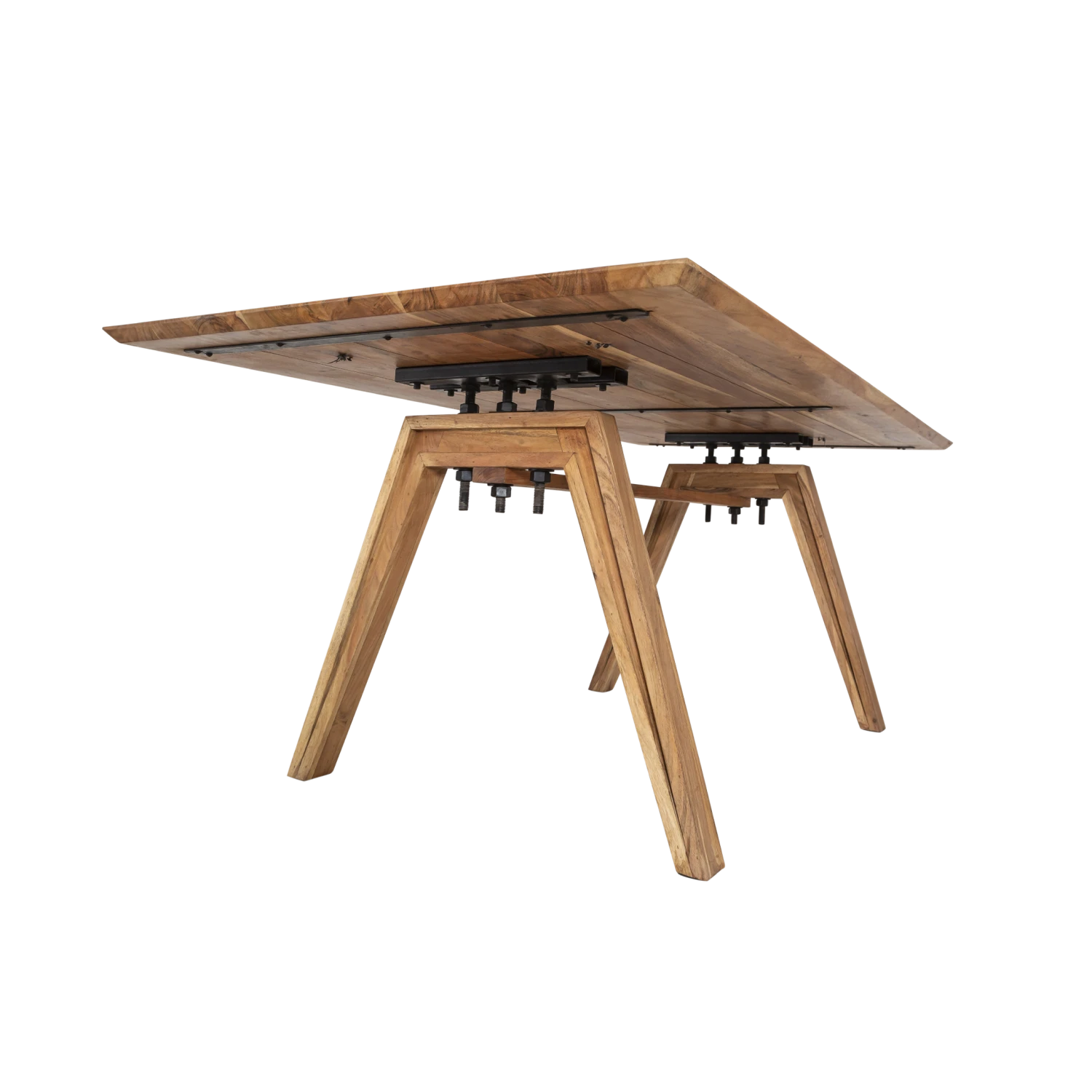 Premièrement, le piétement est très design et singulier. Sa forme et son effet sculpté apportent une réelle personnalité à l’ensemble du meuble. Deuxièmement, la visserie qui est volontairement visible est de taille XXL. Ces vis apportent une réelle valeur ajoutée à la table et tendent doucement vers un style industriel. Une subtile association à laquelle on dit un grand OUI !