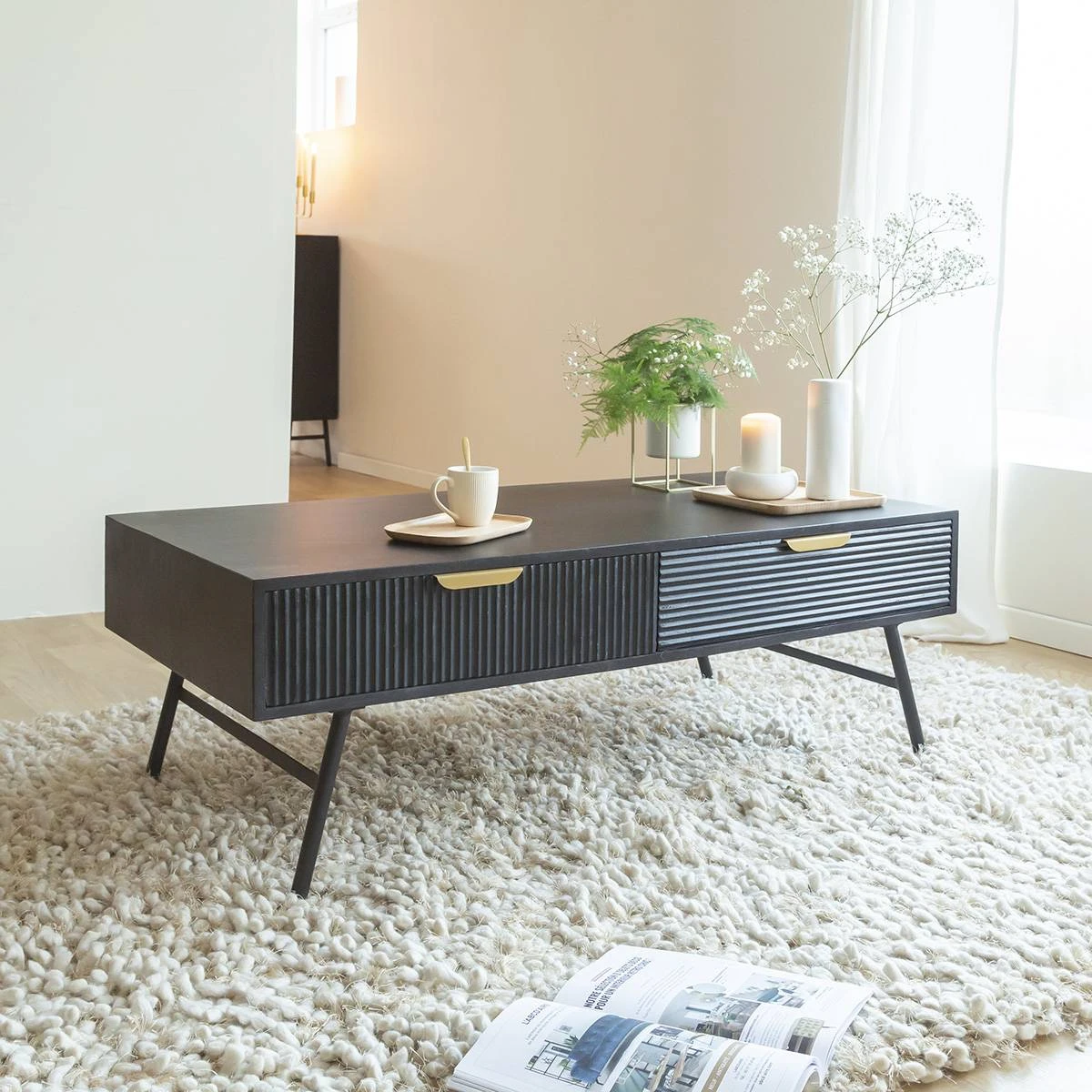Côté rangements, cette table basse de style scandinave vous propose des solutions très avantageuses. Vous bénéficiez de 2 tiroirs en fer situés sur la face. Quoi de plus pratique pour y stocker vos objets du quotidien. Ainsi, vous pourrez y accéder facilement de votre canapé sans avoir à vous déplacer ! Vous pourrez profiter de son large plateau, de 120cm de largeur, pour y ajouter quelques objets de décorations. Cela vous permettra de personnaliser ce meuble original !